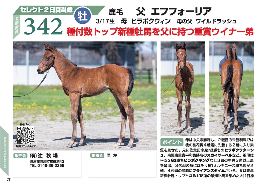 ヒラボクウィンの2024 セレクト当歳 パンフレット PRページはこちら 性別 牡 生月日 3/17 毛色 鹿 父 エフフォーリア 母 ヒラボクウィン 母父 ワイルドラッシュ 販売者 (有)辻牧場 セレクトセール上場番号 No.342 ブラックタイプ ブラックタイプはこちら(JRHA様ページにジャンプします) 動画