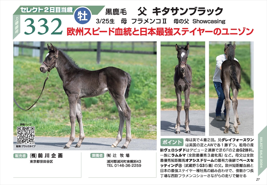 フラメンコⅡの2024 セレクト当歳 パンフレット PRページはこちら 性別 牡 生月日 3/25 毛色 黒鹿 父 キタサンブラック 母 フラメンコⅡ 母父 Showcasing 販売者 (株)前川企画 セレクトセール上場番号 No.332 ブラックタイプ ブラックタイプはこちら(JRHA様ページにジャンプします) 動画