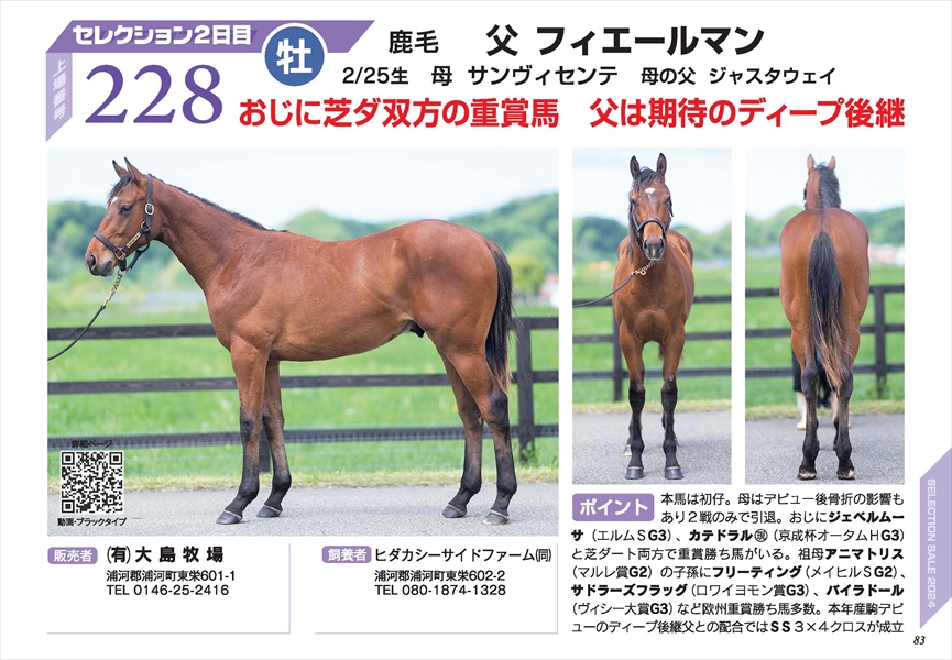 サンヴィセンテ2023 セレクション パンフレット PRページはこちら 性別 牡 生月日 2/25 毛色 鹿 父 フィエールマン 母 サンヴィセンテ 母父 ジャスタウェイ 販売者 (有)大島牧場 セレクションセール上場番号 No.228 ブラックタイプ ブラックタイプはこちら(HBA様ページにジャンプします) 動画