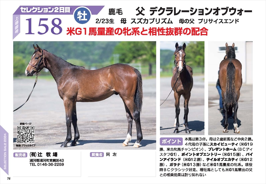 スズカプリズム2023 セレクション パンフレット PRページはこちら 性別 牡 生月日 2/23 毛色 鹿 父 デクラレーションオブウォー 母 スズカプリズム 母父 プリサイスエンド 販売者 (有)辻牧場 セレクションセール上場番号 No.158 ブラックタイプ ブラックタイプはこちら(HBA様ページにジャンプします) 動画