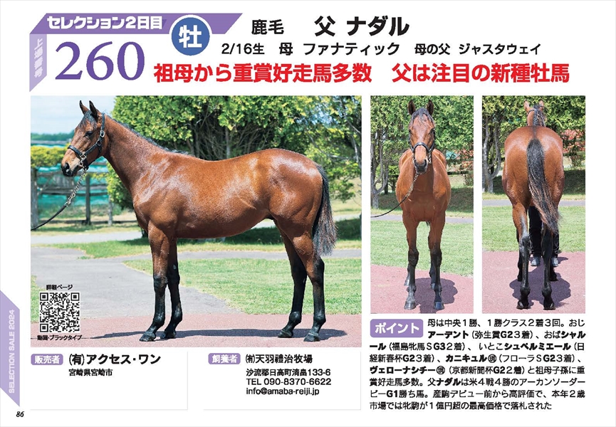 ファナティック2023 セレクション パンフレット PRページはこちら 性別 牡 生月日 2/16 毛色 鹿 父 ナダル 母 ファナティック 母父 ジャスタウェイ 販売者 (有)アクセス・ワン セレクションセール上場番号 No.260 ブラックタイプ ブラックタイプはこちら(HBA様ページにジャンプします) 動画