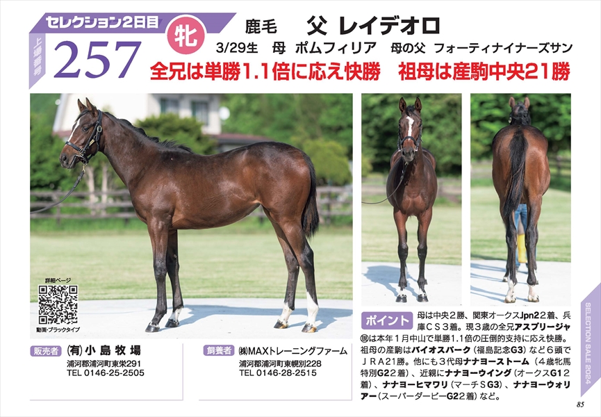 ポムフィリア2023 セレクション パンフレット PRページはこちら 性別 めす 生月日 3/29 毛色 鹿 父 レイデオロ 母 ポムフィリア 母父 フォーティナイナーズサン 販売者 (有)小島牧場 セレクションセール上場番号 No.257 ブラックタイプ ブラックタイプはこちら(HBA様ページにジャンプします)