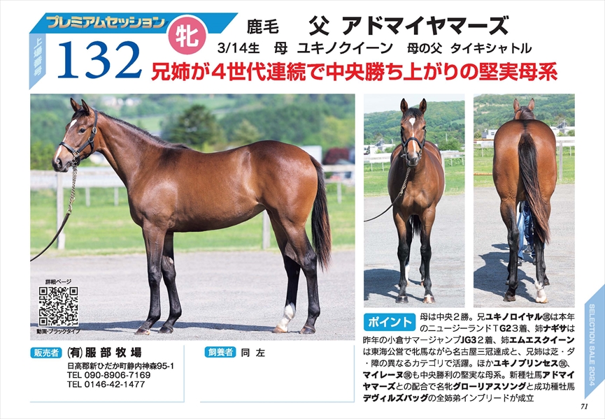 ユキノクイーン2023 Sプレミアム パンフレット PRページはこちら 性別 めす 生月日 3/14 毛色 鹿 父 アドマイヤマーズ 母 ユキノクイーン 母父 タイキシャトル 販売者 (有)服部牧場 セレクションセール上場番号 No.132 ブラックタイプ ブラックタイプはこちら(HBA様ページにジャンプします) 動画