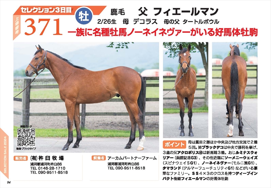 デコラス2023 セレクション パンフレット PRページはこちら 性別 牡 生月日 2/26 毛色 鹿 父 フィエールマン 母 デコラス 母父 タートルボウル 販売者 (有)杵臼牧場 セレクションセール上場番号 No.371 ブラックタイプ ブラックタイプはこちら(HBA様ページにジャンプします)
