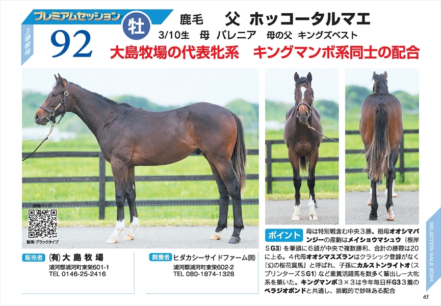 パレニア2023 Sプレミアム パンフレット PRページはこちら 性別 牡 生月日 3/10 毛色 鹿 父 ホッコータルマエ 母 パレニア 母父 キングズベスト 販売者 (有)大島牧場 セレクションセール上場番号 No.92 ブラックタイプ ブラックタイプはこちら(HBA様ページにジャンプします) 動画