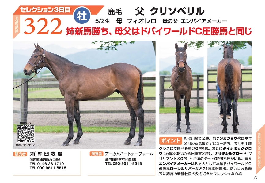 フィオレロ2023 セレクション パンフレット PRページはこちら 性別 牡 生月日 5/2 毛色 鹿 父 クリソベリル 母 フィオレロ 母父 エンパイアメーカー 販売者 (有)杵臼牧場 セレクションセール上場番号 No.322 ブラックタイプ ブラックタイプはこちら(HBA様ページにジャンプします)