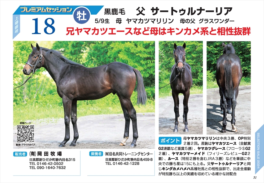 ヤマカツマリリン2023 Sプレミアム パンフレット PRページはこちら 性別 牡 生月日 5/9 毛色 黒鹿 父 サートゥルナーリア 母 ヤマカツマリリン 母父 グラスワンダー 販売者 (有)岡田牧場 セレクションセール上場番号 No.18 ブラックタイプ ブラックタイプはこちら(HBA様ページにジャンプします) 動画