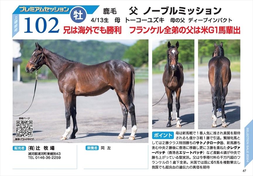 トーコーユズキ2023 Sプレミアム パンフレット PRページはこちら 性別 牡 生月日 4/13 毛色 鹿 父 ノーブルミッション 母 トーコーユズキ 母父 ディープインパクト 販売者 (有)辻牧場 セレクションセール上場番号 No.102 ブラックタイプ ブラックタイプはこちら(HBA様ページにジャンプします) 動画