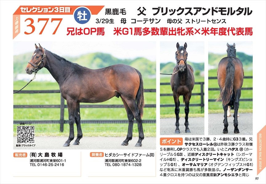 コーテサン2023 セレクション パンフレット PRページはこちら 性別 牡 生月日 3/29 毛色 黒鹿 父 ブリックスアンドモルタル 母 コーテサン 母父 ストリートセンス 販売者 (有)大島牧場 セレクションセール上場番号 No.377 ブラックタイプ ブラックタイプはこちら(HBA様ページにジャンプします) 動画